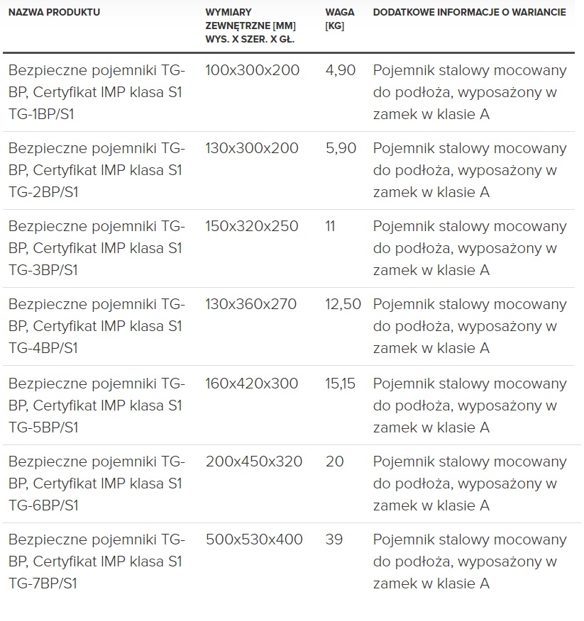 Kasety bezpieczne pojemniki TG-PB Klasa S1 to modele wykorzystywane przenoszenia, przewożenia broni, przechowywania gotówki, dokumentów oraz wartościowych przedmiotów. Możliwość zamontowania pojamnika w bagażniku. Standardowo wyposażone w zamek kluczowy z dwoma kluczami dwuzabierakowymi, Certyfikat IMP kl.A, VdS kl.1 . Pojemnik występuje w dwóch wariantach wersjach, różniących się od siebie wyposażeniem oraz wymiarami. Dzięki temu możliwy jest wybór modelu najbardziej odpowiadającego Państwa oczekiwaniom.