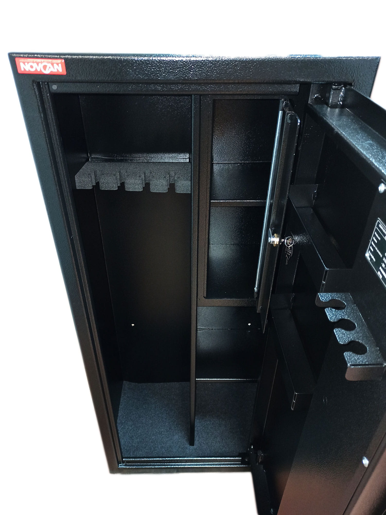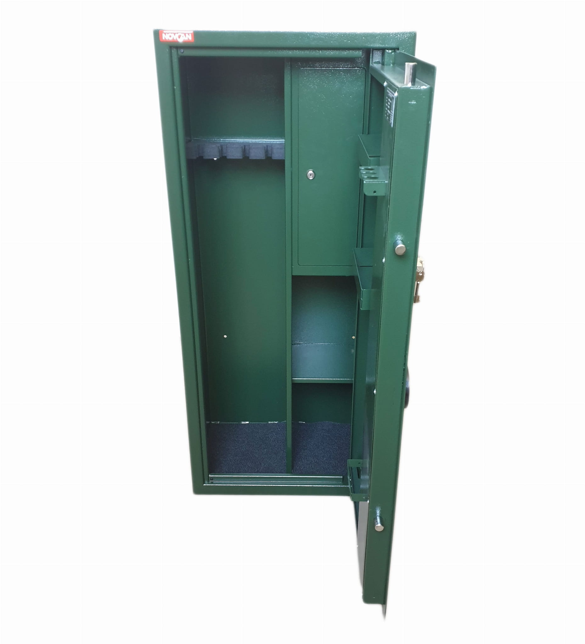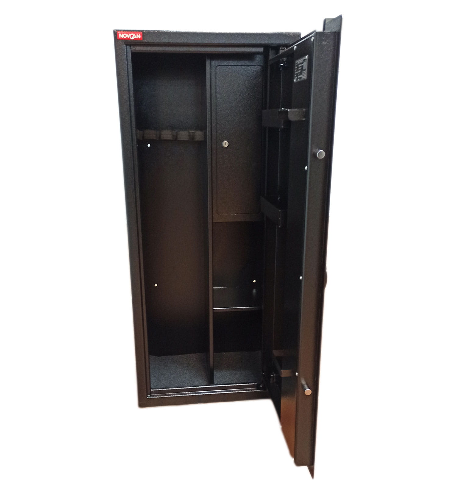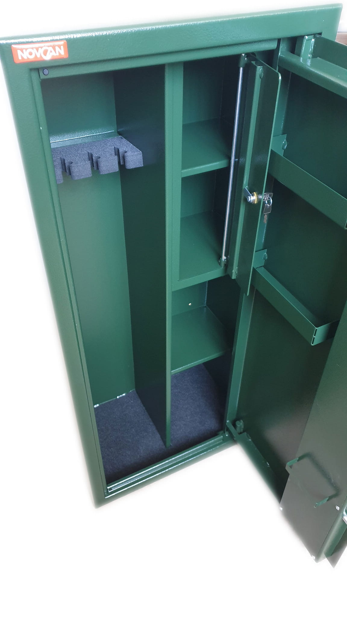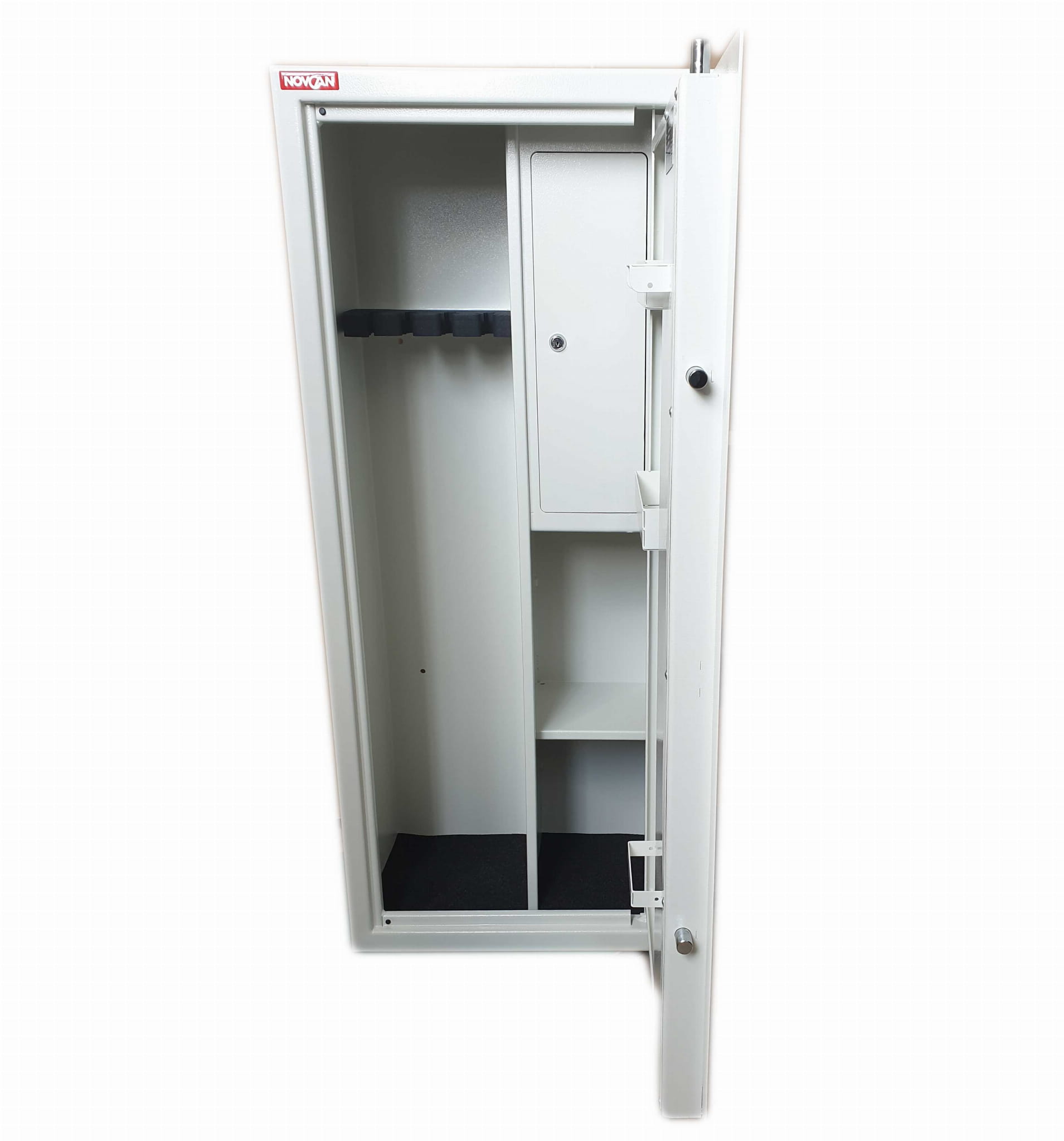Sejfy na broń długą i krótką Novcan służą do odpowiedniego zabezpieczenia i przechowywania broni. Obowiązek ustawowy wymaga aby broń i amunicja były odpowiednio zabezpieczone. Jest to też podstawowa zasada bezpieczeństwa, której stosowanie pomoże uniknąć problemów związanych z niepowołanym dostępem do broni. Sejfy Novcan są przeznaczone do montażu wolnostojącego, a także do zabudowy w meblach lub wnękach meblowych. Jednopłaszczowa konstrukcja drzwi i korpusu, wykonana z solidnej stali zapewnia wysoką odporność na sforsowanie.
