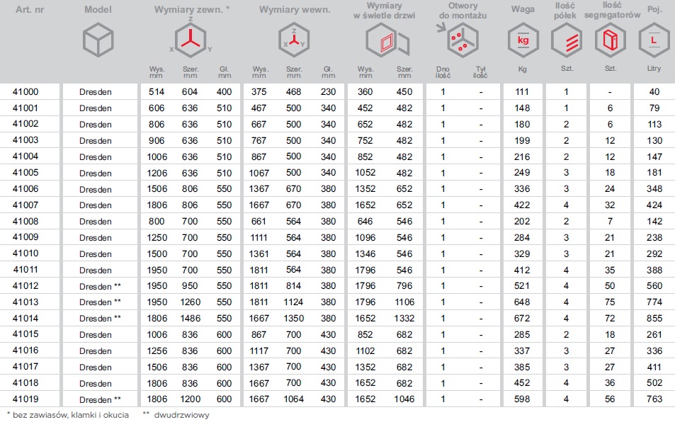 - Kąt otwarcia drzwi: 180°
