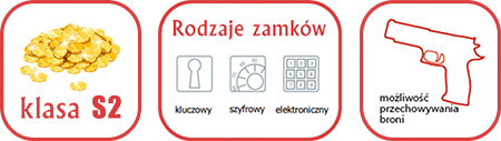 - Zamek: sejf zamykany zamkiem kluczowym VdSKlasa I/IMP-Klasa A (standardowo z dwoma kluczami o długości 95 mm)