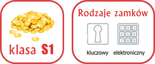- Zamek drzwi: sejf zamykany atestowanym zamkiem kluczowym dwuzabierakowym w klasie A z kompletem 2 szt. kluczy.
