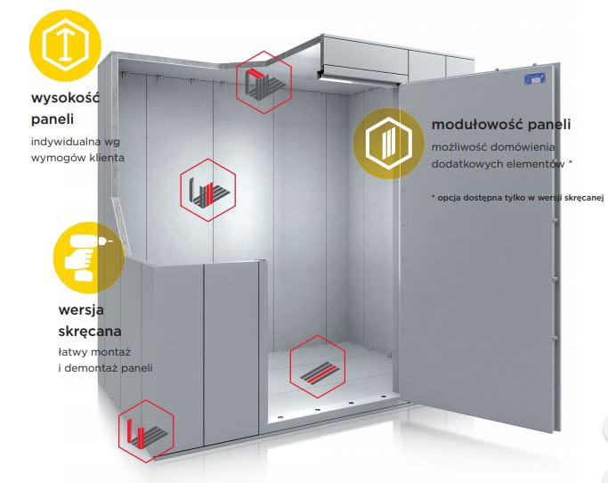 Skarbiec to dedykowane pomieszczenie do przechowywania znacznej ilości wartościowych przedmiotów. Może służyć również jako bezpieczny pokój dla domowników lub pracowników w sytuacjach kryzysowych. Każdy projekt realizowany jest indywidualnie. Konstrukcja wykonana z łączonych paneli sprawia, że skarbiec może być dostosowany do każdego pomieszczenia. Oferujemy pełne doradztwo oraz atrakcyjną ofertę cenową. Zapraszamy do zapoznania się z kartą produktu dostępną w formie PDF do pobrania tutaj.