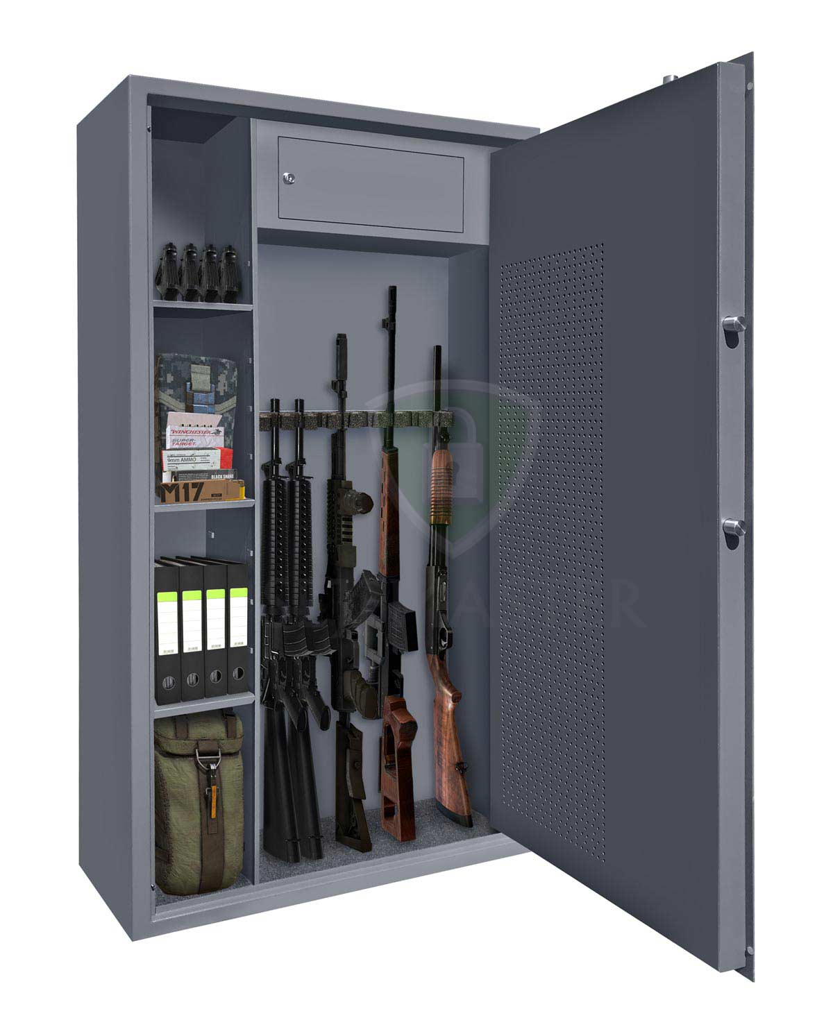 Szafa na broń długą klasy S1, przeznaczona do przechowywania i ochrony przed dostaniem się w niepowołane ręce broni oraz wyposażenia związanego z bronią palną. Elegancki design zapewnia odpowiednią prezencję broni oraz funkcjonalność i wygodę przechowywania broni zarówno długiej jak i krótkiej.