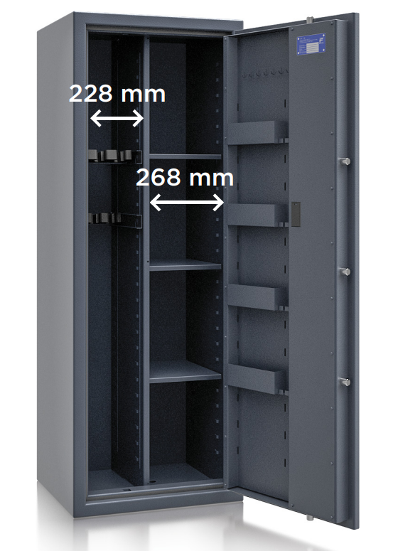 Szafy na broń długą z serii Luzern WF MAX Kombi Klasa 0, przeznaczone są do przechowywania broni długiej, wysokość ustawienia broni 1390 mm. Posiada certyfikat ECB•S klasy 0. Klasa wg normy EN 1143-1 spełniająca wymagania techniczne do przechowywania broni palnej i amunicji.