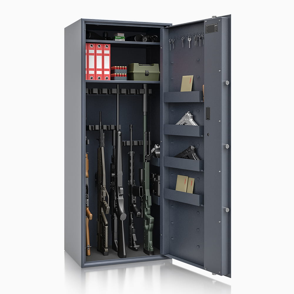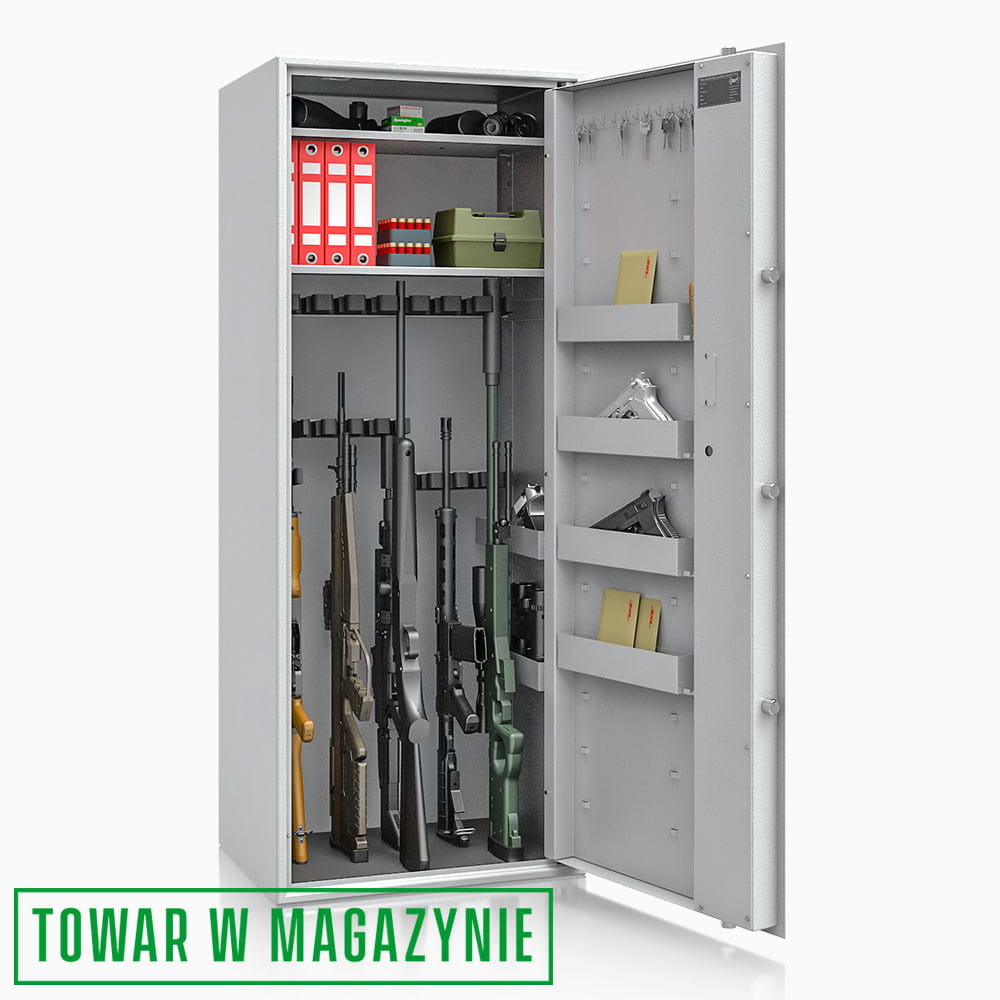 Poprzez możliwość przestawiania na wysokości półki jak i uchwytów na broń – można dowolnie spersonalizować wnętrze, umożliwiając dogodne ustawienie broni o różniej wysokości. Sejf standardowo wyposażony w dwie funkcjonalne przestawne na wysokości półki. Przestawne półki, regulują wysokość użytkową wewnątrz sejfu. Na drzwiach wewnątrz sejfu umieszczona listwa hakowa do zawieszania kluczy, lornetek oraz innych przedmiotów codziennego użytku. Dzięki nowej konstrukcji płyty osłonowej drzwi, zostały umieszczone na niej przestawne półki, które nie zabierają przestrzeni wewnątrz sejfu.