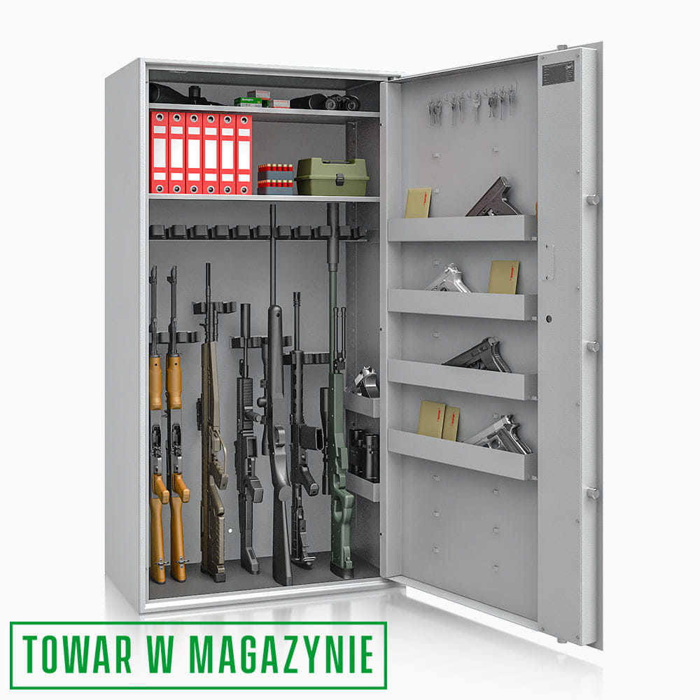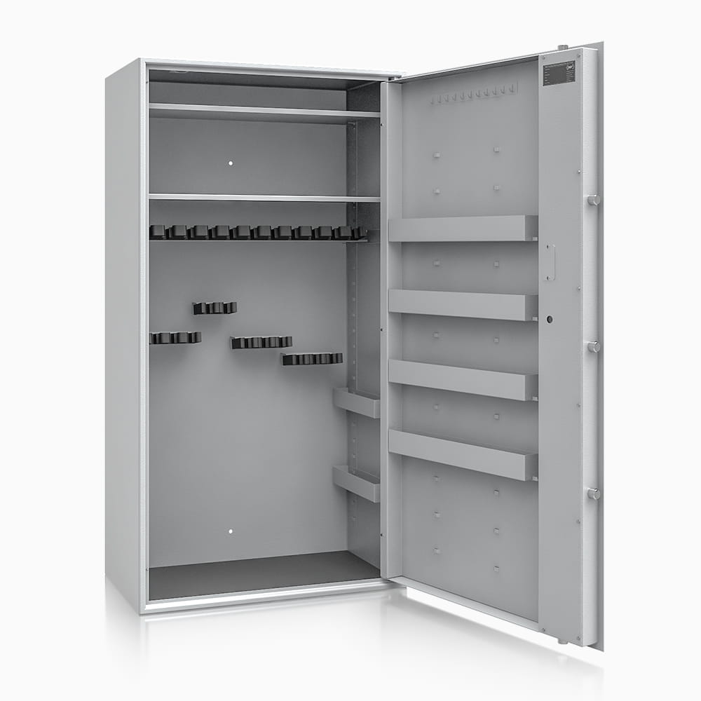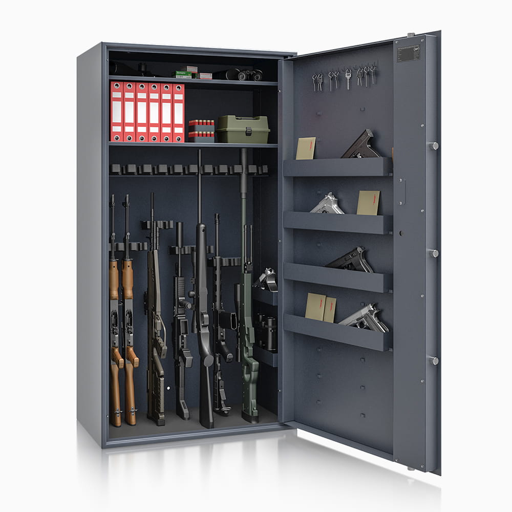 Poprzez możliwość przestawiania na wysokości półki jak i uchwytów na broń – można dowolnie spersonalizować wnętrze, umożliwiając dogodne ustawienie broni o różniej wysokości. Sejf standardowo wyposażony w dwie funkcjonalne przestawne na wysokości półki. Przestawne półki, regulują wysokość użytkową wewnątrz sejfu. Na drzwiach wewnątrz sejfu umieszczona listwa hakowa do zawieszania kluczy, lornetek oraz innych przedmiotów codziennego użytku. Dzięki nowej konstrukcji płyty osłonowej drzwi, zostały umieszczone na niej przestawne półki, które nie zabierają przestrzeni wewnątrz sejfu.