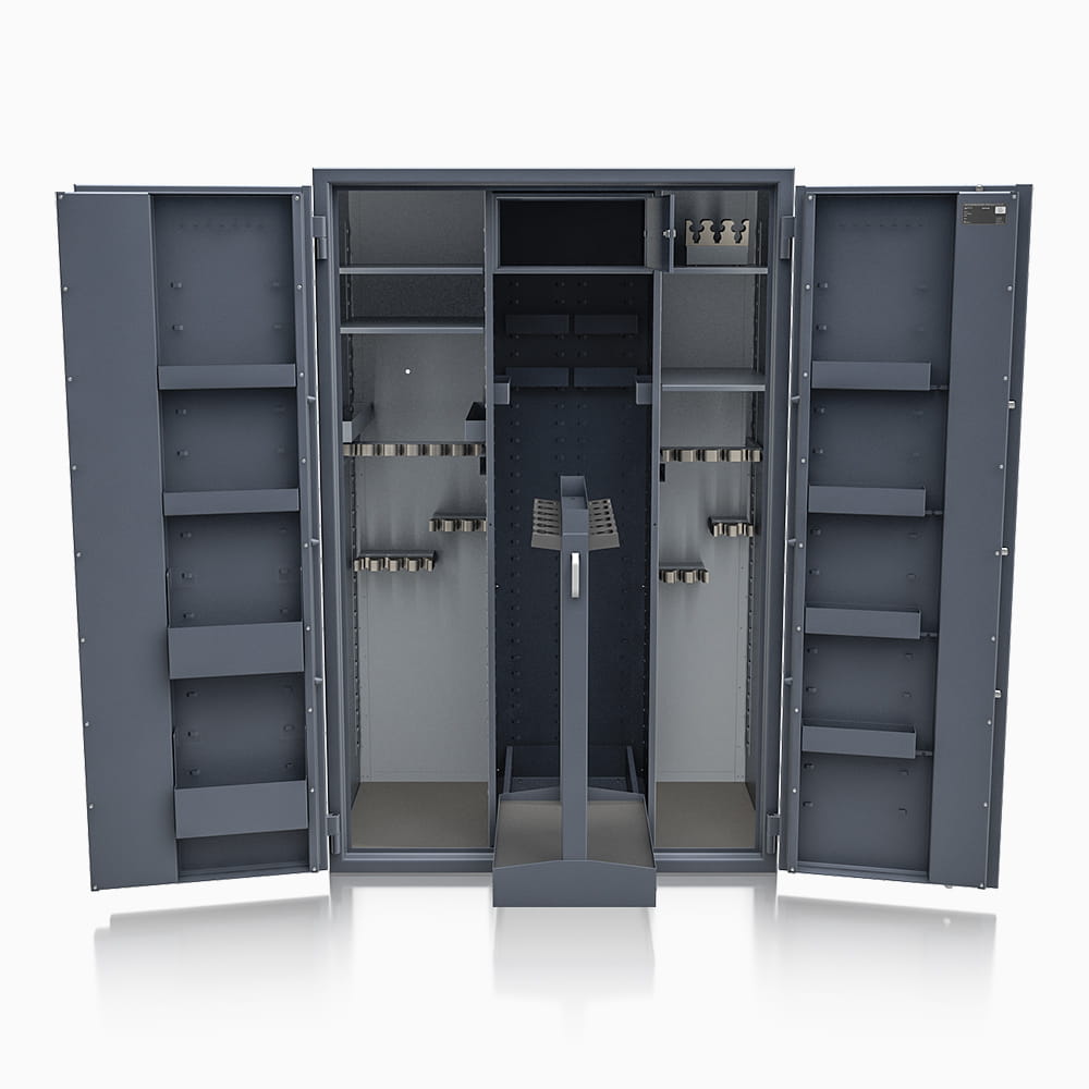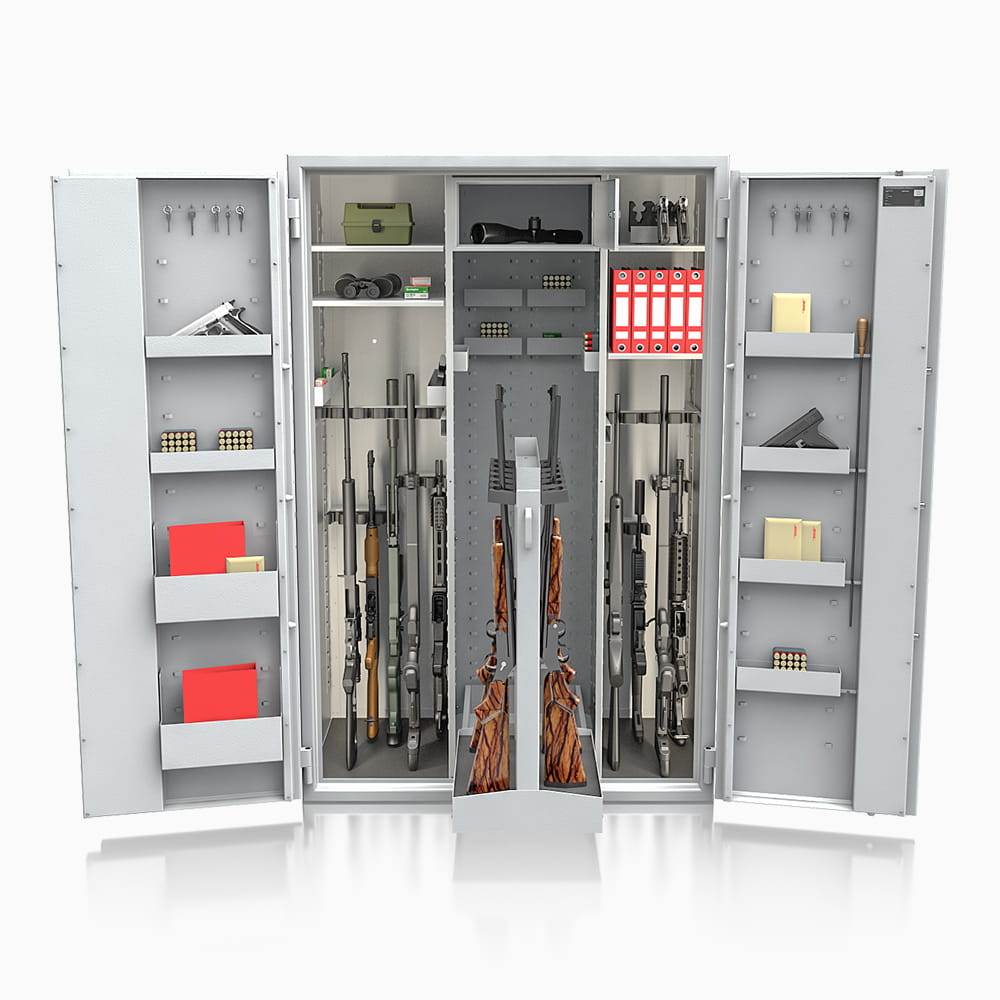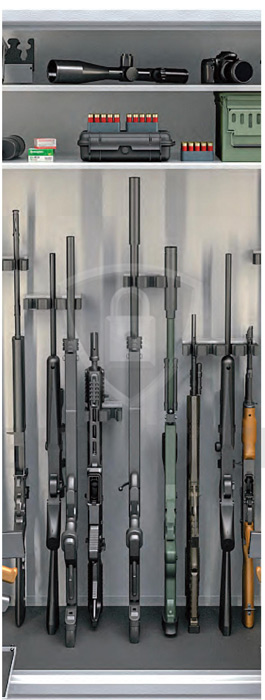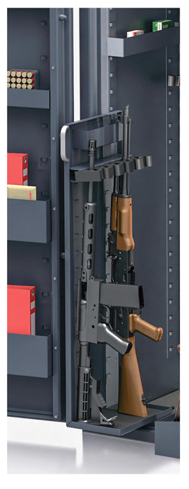 Poprzez możliwość przestawiania na wysokości półek jak i uchwytów na broń – można dowolnie spersonalizować wnętrze umożliwiając dogodne ustawienie broni o różnej wysokości