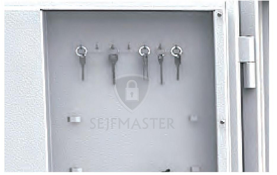 Na drzwiach wewnątrz sejfu umieszczona jest listwa hakowa do zawieszania kluczy
