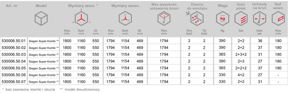 Uchwyty na broń mocowane na magnesach mogą służyć do ustawiania broni krótkiej. W zależności od modelu - szafy Siegen Super oraz Siegen Super Kombi posiadają indywidulane wyposażenie pozwalające na dobranie modelu według własnych potrzeb. Każda z szaf wyposażona jest w piankowe dywaniki bezpiecznie umieszczona w sejfie na broń. na dnie sejfu