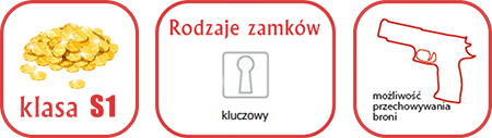 - Standardowo wyposażona w zamek kluczowy z dwoma kluczami dwuzabierakowymi, Certyfikat IMP kl. A, VdS kl.1