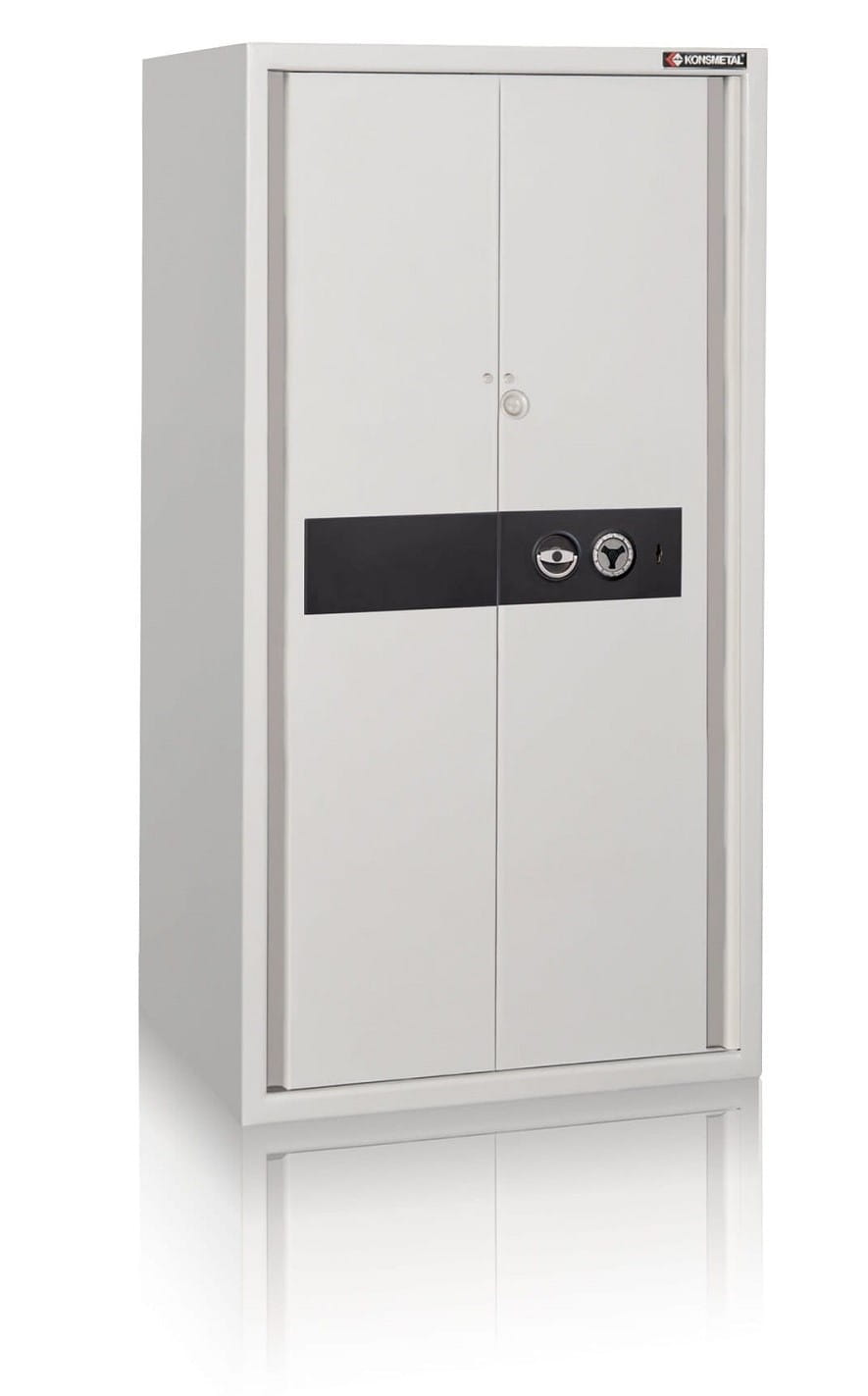 - Szafa wyposażona w zamek kluczowy kl. B wg EN 1300 z dwoma kluczami oraz zamek mechaniczny szyfrowy kl. B wg EN 1300, trzytarczowy o cichym przesuwie posiadajcy minimum 100 podziałek na pokrętle. Skala nastawień przy której w przypadku każdej tarczy zamek nie otworzy się jeżeli pokrętło przekręcone jest więcej niż o jedną kreskę podziałki po obu stronach właściwej kreski podziałki. Możliwa zmiana kombinacji przy użyciu klucza od tyłu obudowy zamka. Zamek jest zabezpieczony przed działaniem destrukcyjnym w tym przed przewierceniem oraz atakiem radiologicznym