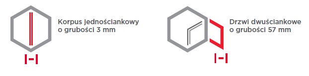 - Drzwi: dwuściankowe o grubości 57 mm