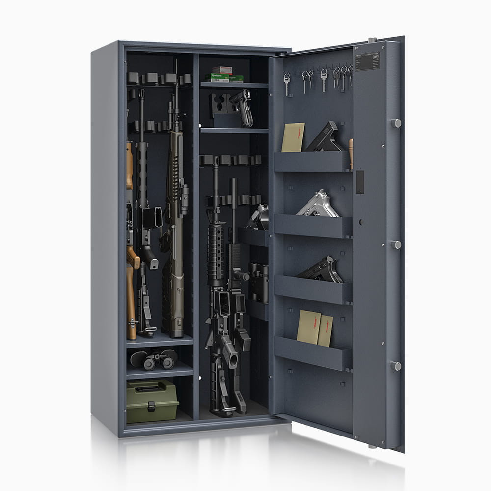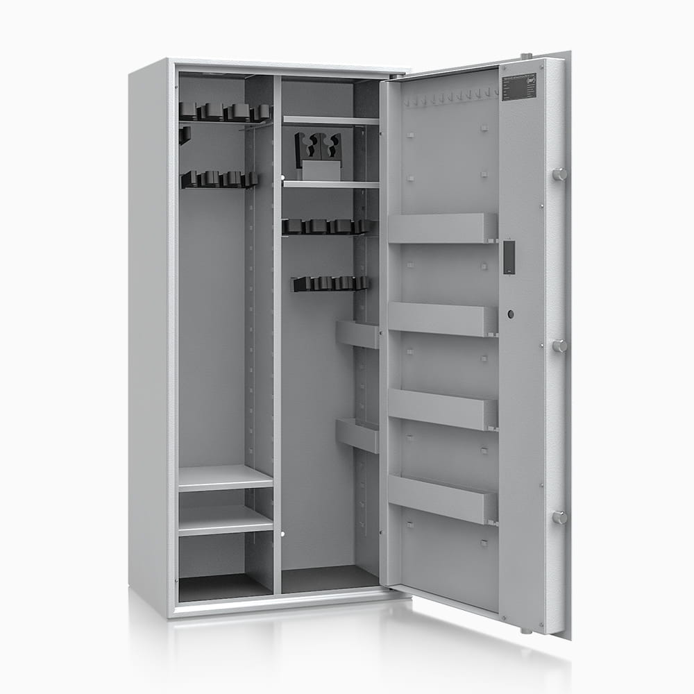 Poprzez możliwość przestawiania na wysokości półki jak i uchwytów na broń – można dowolnie spersonalizować wnętrze, umożliwiając dogodne ustawienie broni o różniej wysokości. Sejf standardowo wyposażony w dwie funkcjonalne przestawne na wysokości półki. Przestawne półki, regulują wysokość użytkową wewnątrz sejfu. Na drzwiach wewnątrz sejfu umieszczona listwa hakowa do zawieszania kluczy, lornetek oraz innych przedmiotów codziennego użytku. Dzięki nowej konstrukcji płyty osłonowej drzwi, zostały umieszczone na niej przestawne półki, które nie zabierają przestrzeni wewnątrz sejfu.
