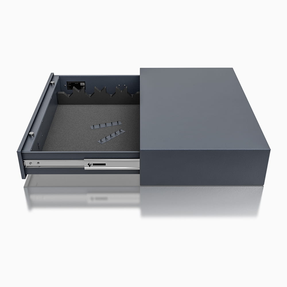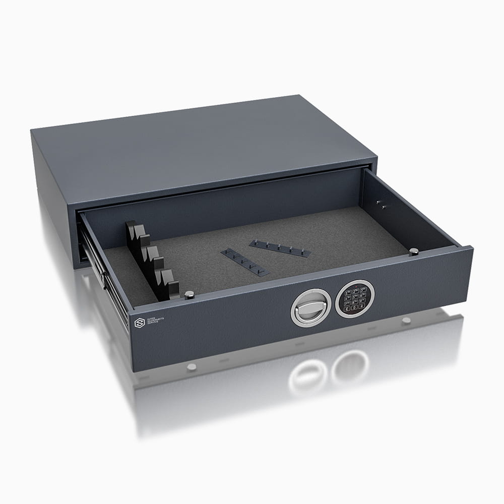 Szuflada w standardzie wyłożona jest wykładziną zabezpieczającą deponowaną broń przed porysowaniami. W wybranych modelach w celu zwiększenia funkcjonalności i wygody użytkowania - szuflada została wyposażona w piankowe uchwyty na broń.