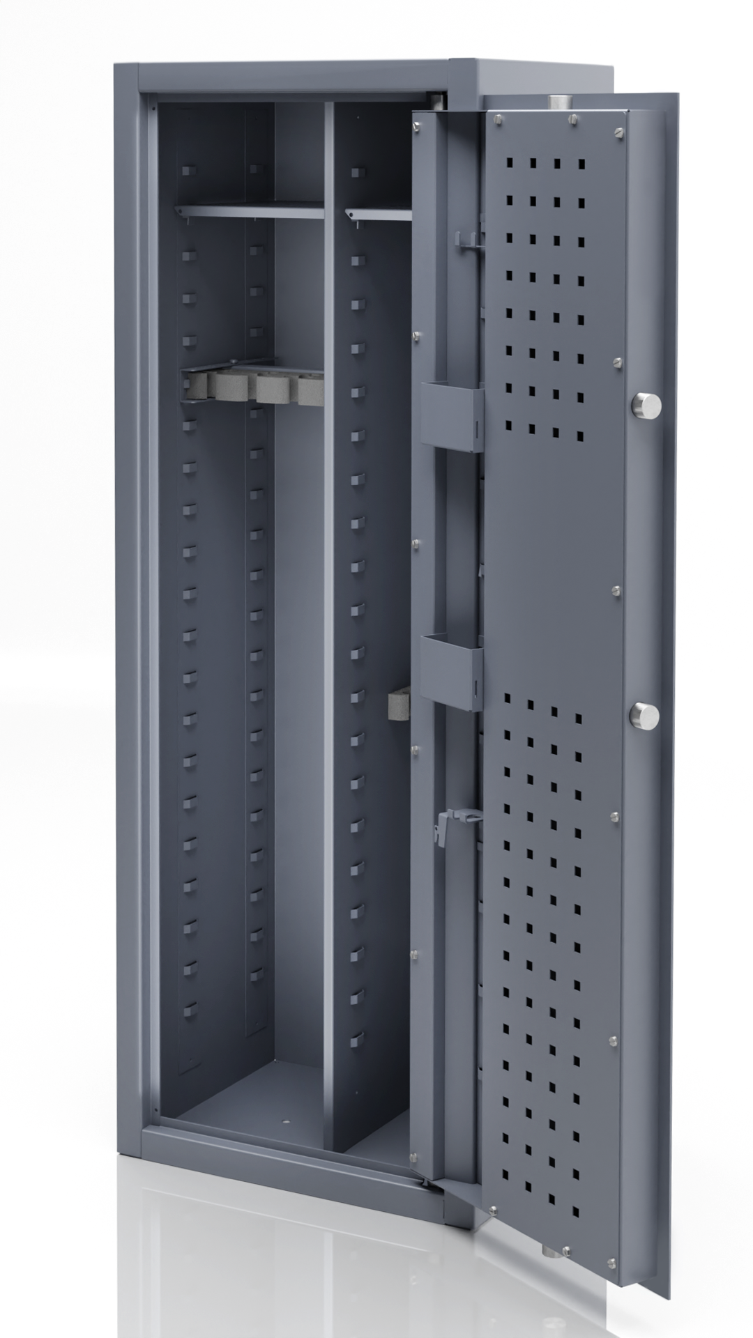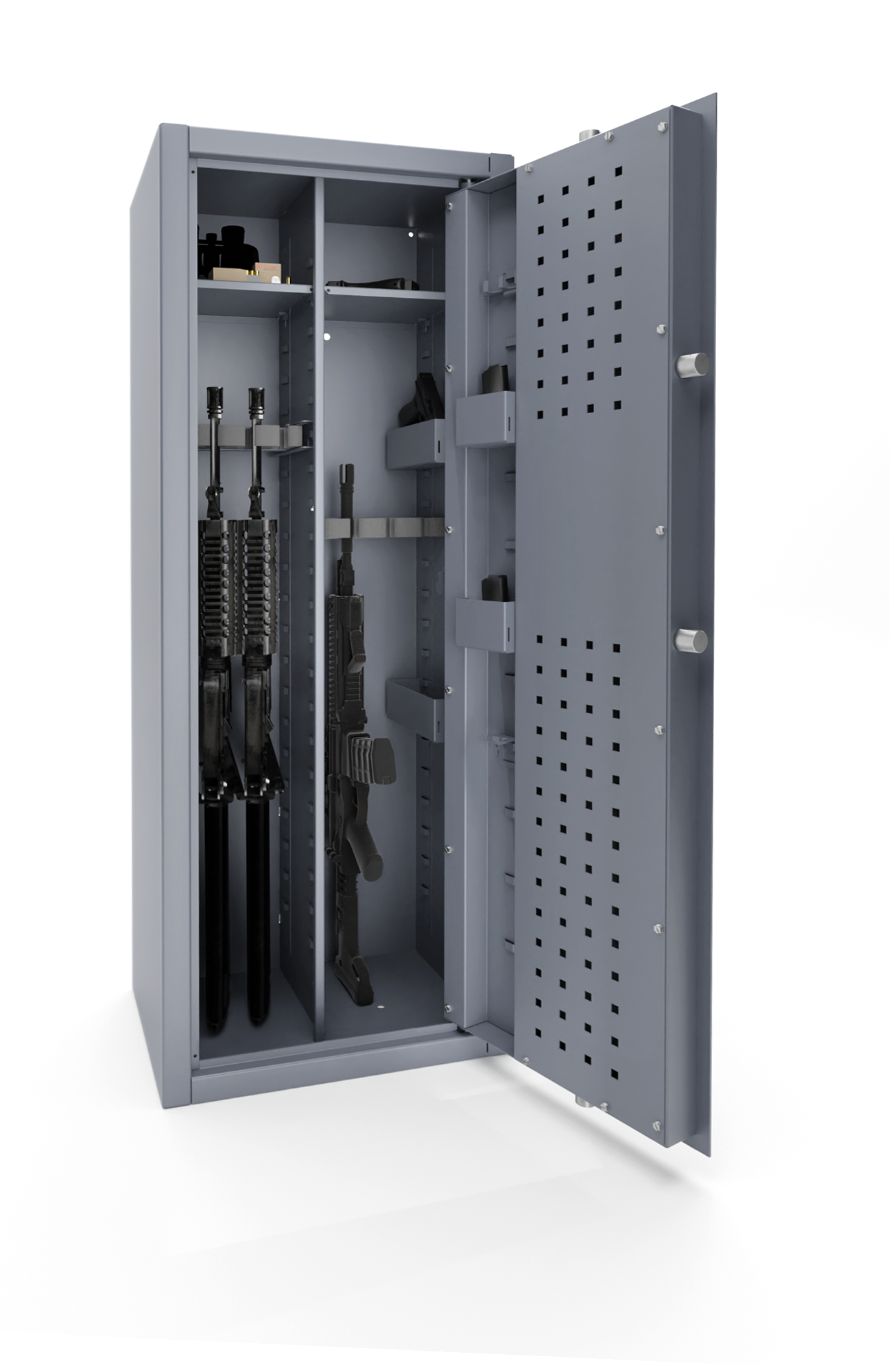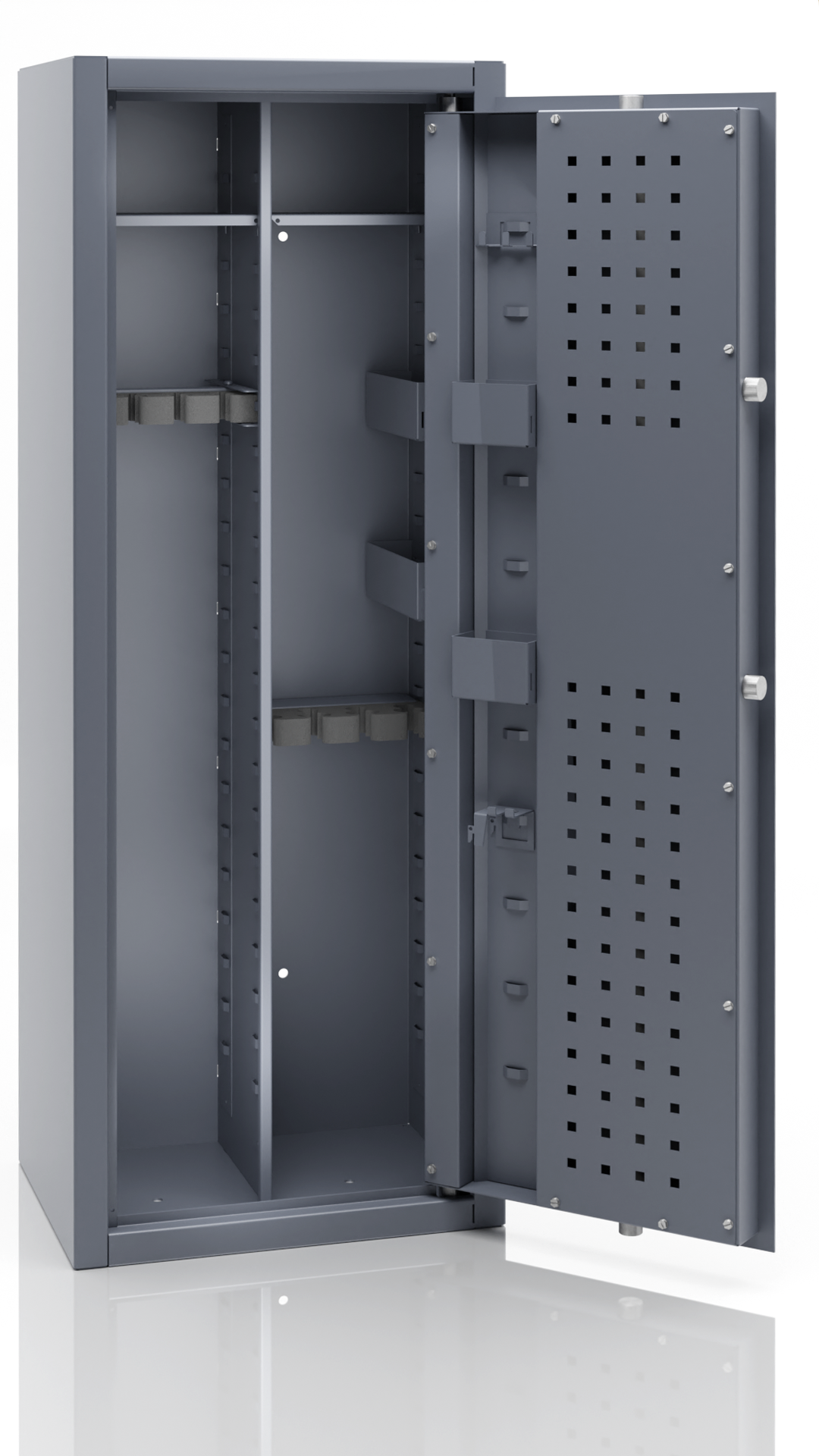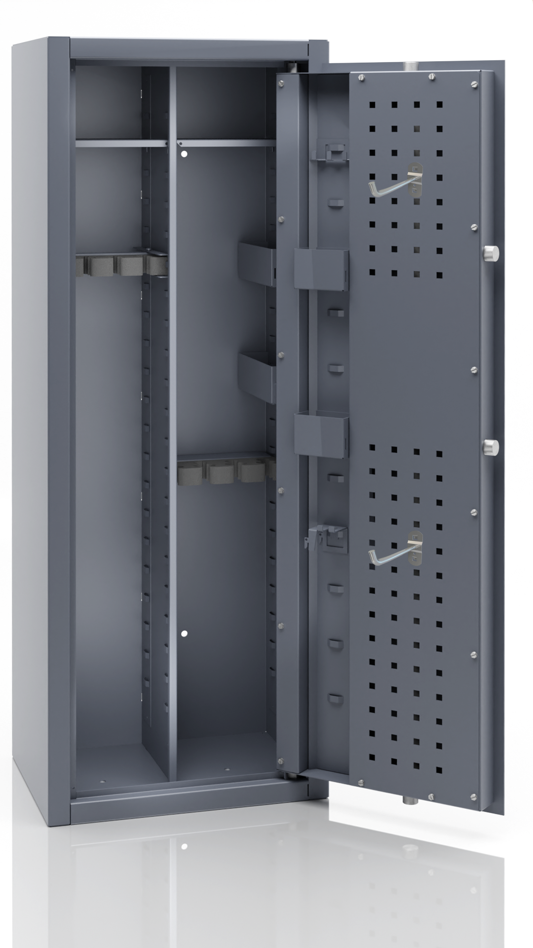 Szafa na broń w klasie S1 ARSENAŁ 1243 FLEX COMBI oferuje pełną możliwość własnej aranżacji wnętrza, dzięki zastosowaniu wszystkich przestawnych elementów wyposażenia, zarówno półek, jak i wszelkich typów uchwytów oraz pojemników. Drabinka na drzwiach i ścianach bocznych umożliwia dowolny wybór miejsca mocowania.