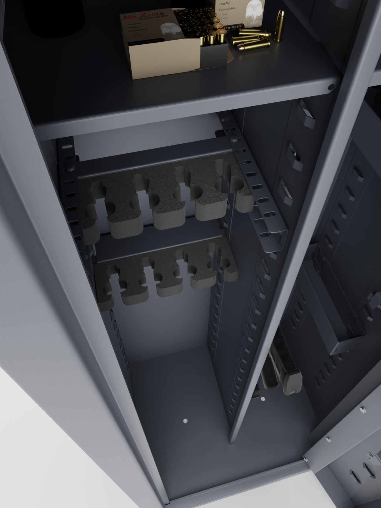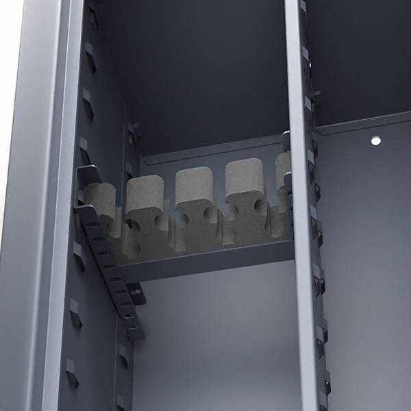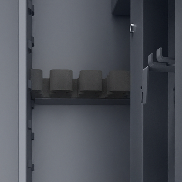 Uchwyt na 4 sztuki broni na szynie przestawnej pozwala na dowolne ustawienie w dwóch osiach, zarówno w pionie jak i w poziomie. Wygodne pojemniki do zawieszania w dwóch rozmiarach Pojedyncze uchwyty magnetyczne pozwalają na precyzyjne umocowanie broni na dowolnej wysokości wewnątrz sejfu. Dostosowane do broni długiej i krótkiej. Wykonane z elastycznego i trwałego kompozytu. Możliwość ustawienia uchwytów na broń w dwóch rzędach. Przestawne uchwyty na klucze i wyciory.